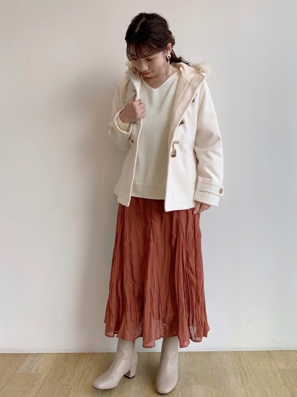 お客様の声から作られた理想のニット♡ 開きすぎないVネックと丸みのあるボリューム袖が可愛い🥺 スリットが斜めに入っているのでインでもアウトでも着やすいです✨ 定番のダッフルコートは白で大人かわいく❤️