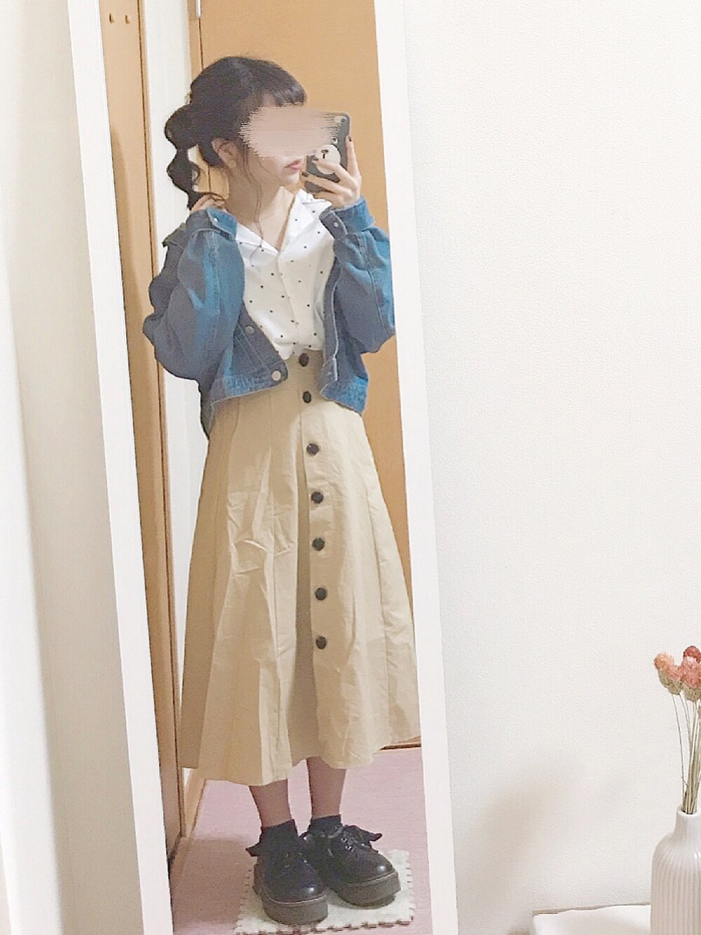 ピクニックコーデ🥪💓 ショート丈のデニムジャケットは Aラインシルエットのスカートと 相性がよくて最近よくしてます☺️🌸🌸 靴のサイズは22.5センチで、ジャストサイズ をはいています🙌 今回も見てくださりありがとうございます☺️ インスタにもぜひ遊びに来てください🐥🍎 ▶︎ @cha_kobito