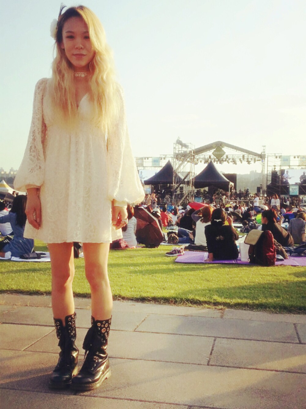 오랜만에 락페스티벌에 놀러갔다:) 광년이처럼 꽃삔도 달고, 아주 여성스러운 원피스에 닥터마틴 부츠를 신어주었다. 잘 안보이지만 꽃삔 옆으로 공작새 깃털도 달았다//_// 결론 : 락페에는 닥마지♥