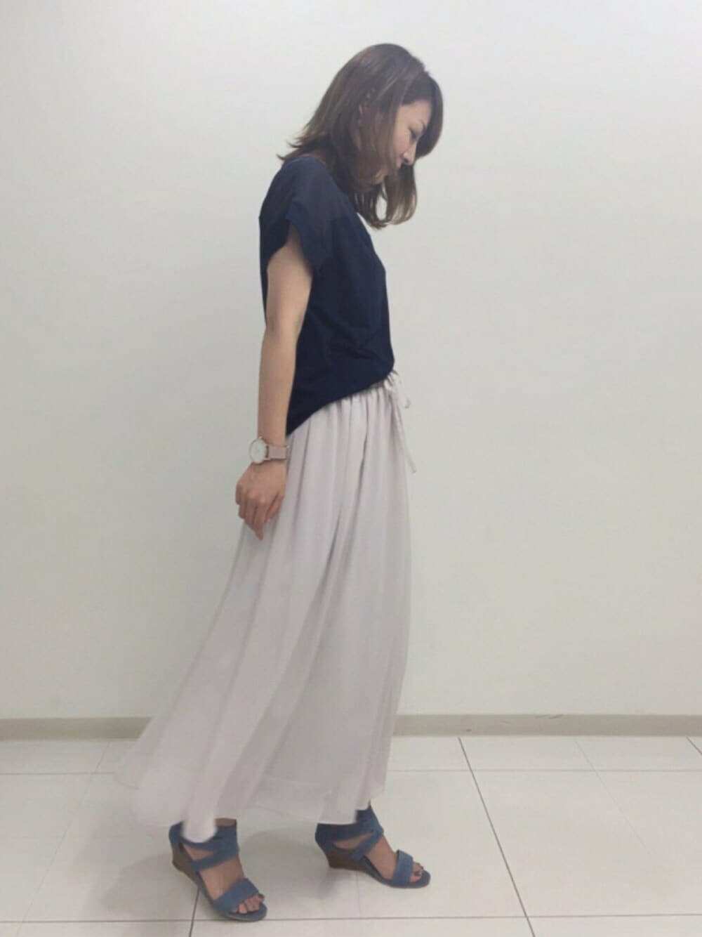 グレーとネイビーのシンプルコーデです♪ スカートはふんわりだけど、薄いグレーなので甘くなりすぎなくてとてもいいです☆