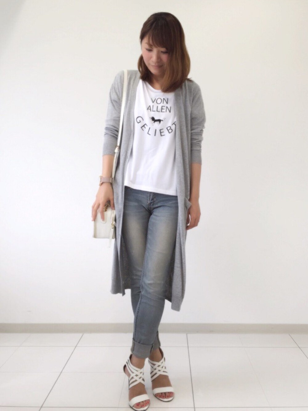 ロングカーデのパンツスタイルです。 犬のイラストがかわいい🐶❤️ 小物は白で爽やかに!