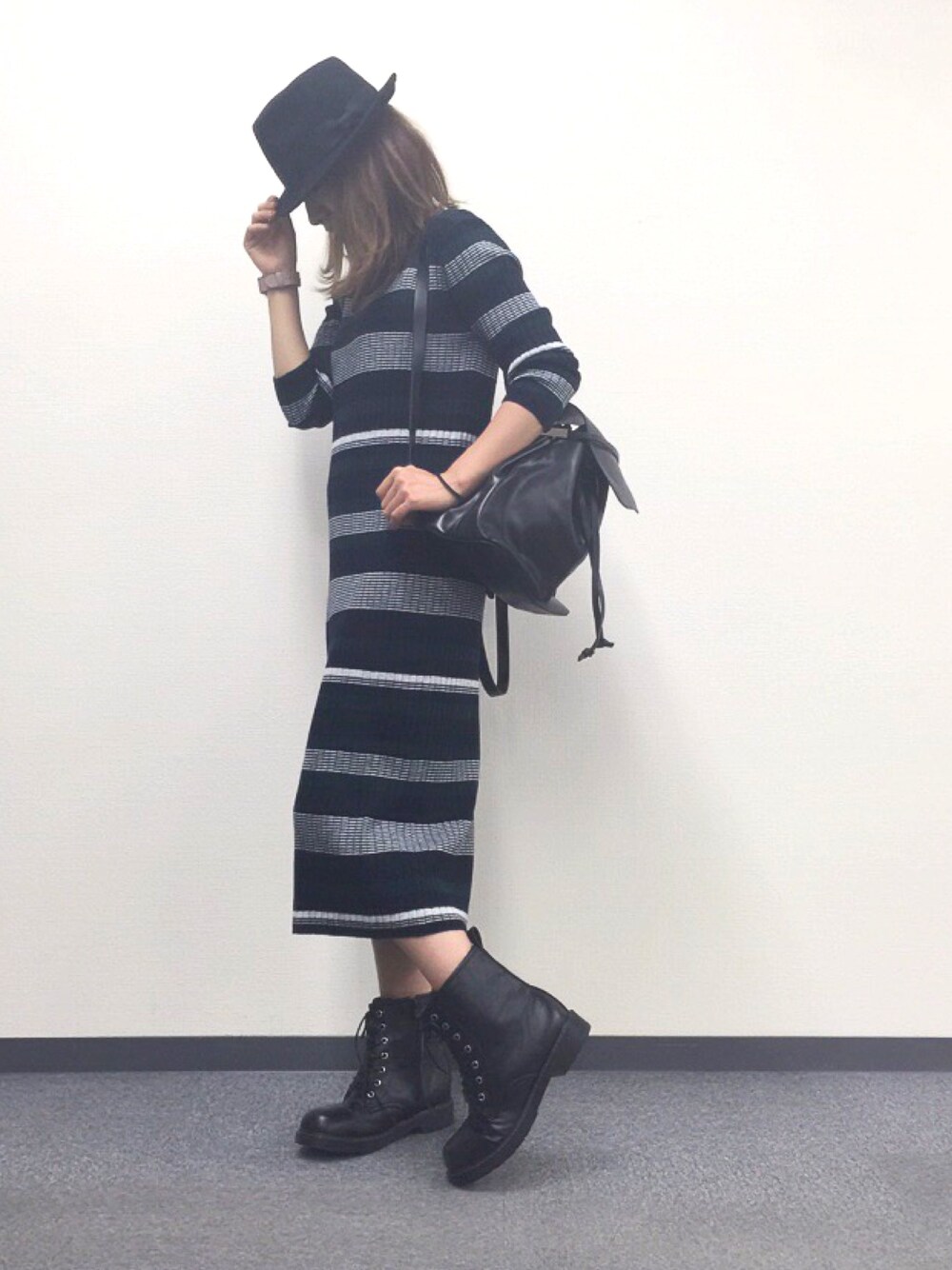 ニットワンピです。 ランダムなボーダーなのでスッキリ見えます⭐️ 小物を黒でまとめてちょっぴりハードに😄