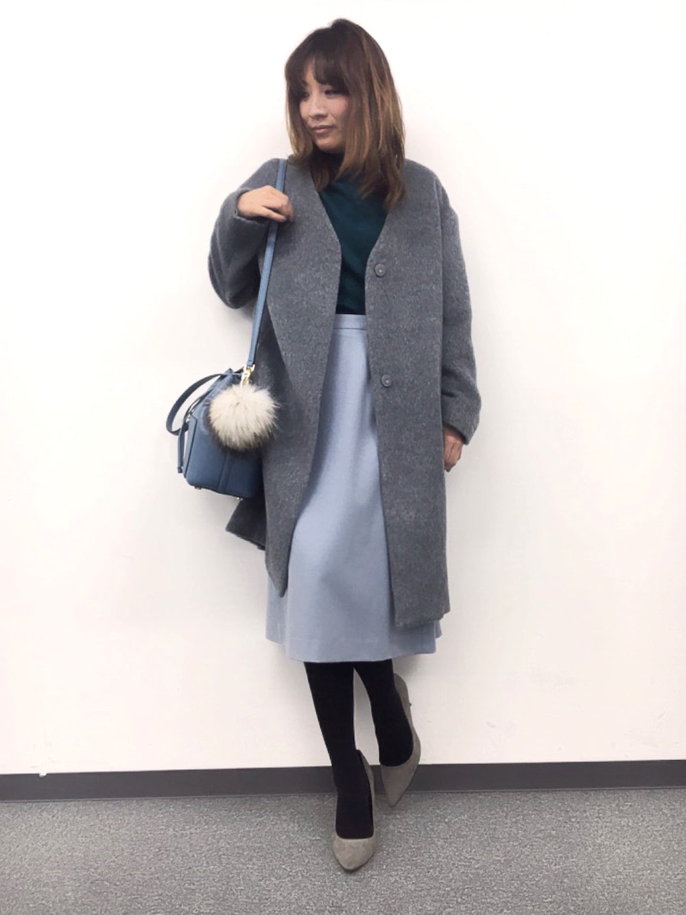 グレーのアウターはノーカラーなので首元スッキリ😄 タートルと相性いいですね⭐︎