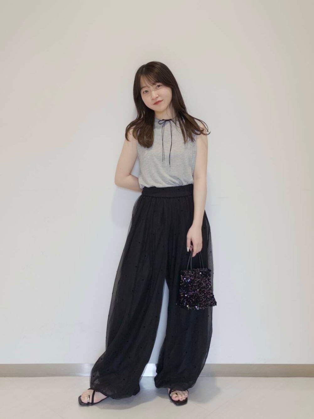 ドット柄のバルーンパンツでラフだけど可愛いコーデです💕 ウエストはゴムしようになっており、身長152センチの私でも裾はゴムになっているので安心して履くことができる丈感です👍🏻 動くたびに揺れるバルーンパンツはシンプルなトップスに合わせるだけでシルエットがとても可愛くなりおすすめです! 是非店頭にてお試し下さい😊