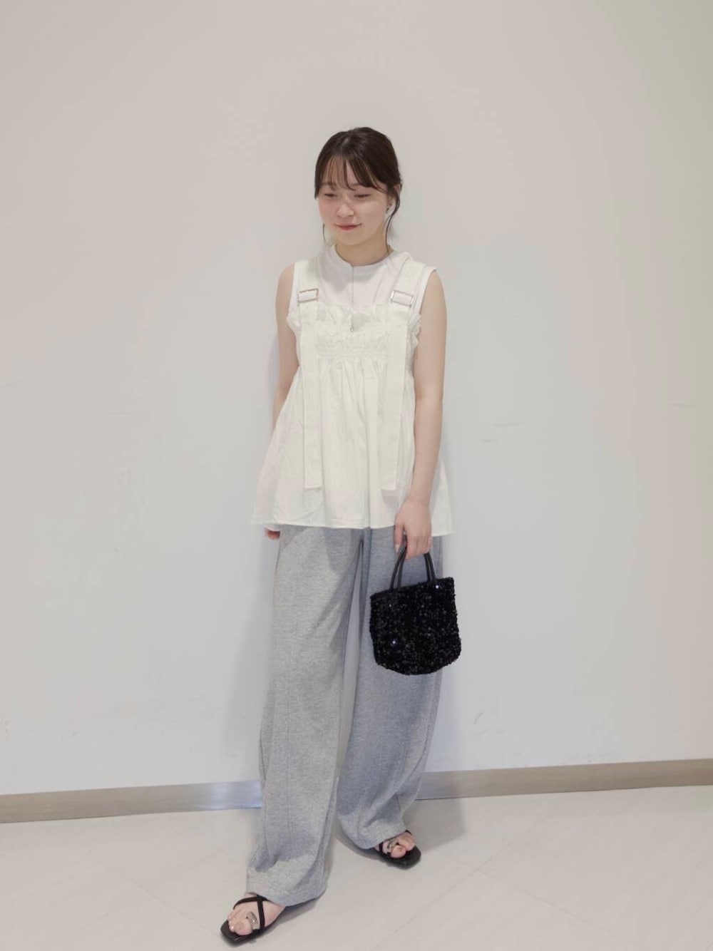 グレーと白の爽やかコーデです☺️ このスウェットパンツはなんと言っても形がキレイです💕 カーブが入っておりシンプルなスウェットパンツをアップデート出来ちゃいます! 身長152センチで、厚めのシューズを履く場合少し上めで履いてます! ペタンコの場合は、折り返して着用するといい感じでした! 是非店頭にてお試しください☺️
