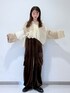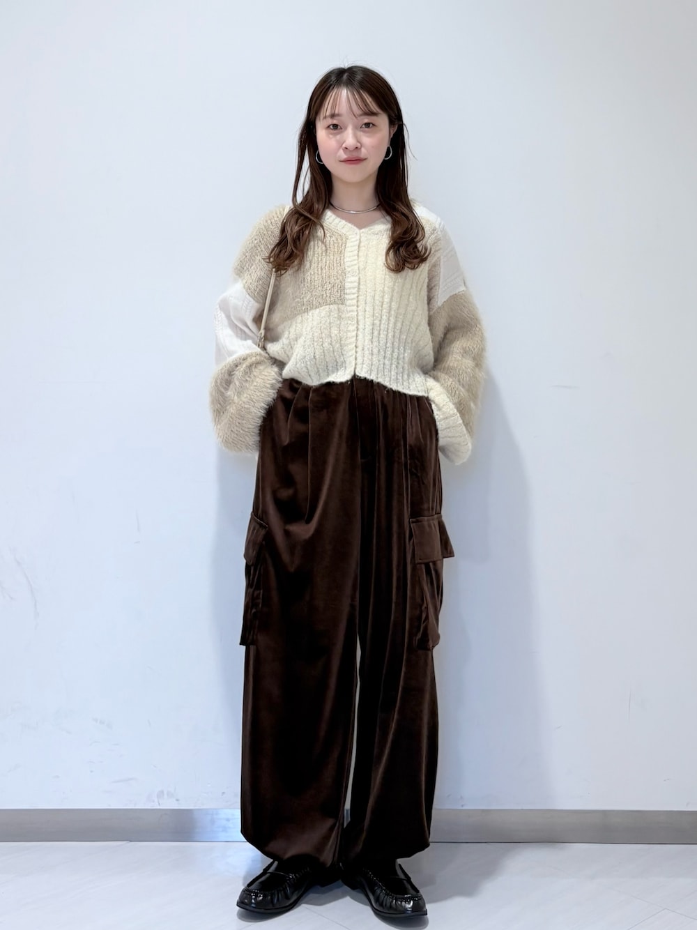 ベロアのカーゴパンツコーデです! 足首にはドロストがついているので絞ると152センチでも問題なく履けます🕺✨ペタンコでも◎ ウエストは後ろ側が混む仕様になっており履いていてとっても楽チンです! 今年の秋冬はベロア素材のアイテムはトレンド感抜群なので是非店頭にてお試し下さい☝🏻