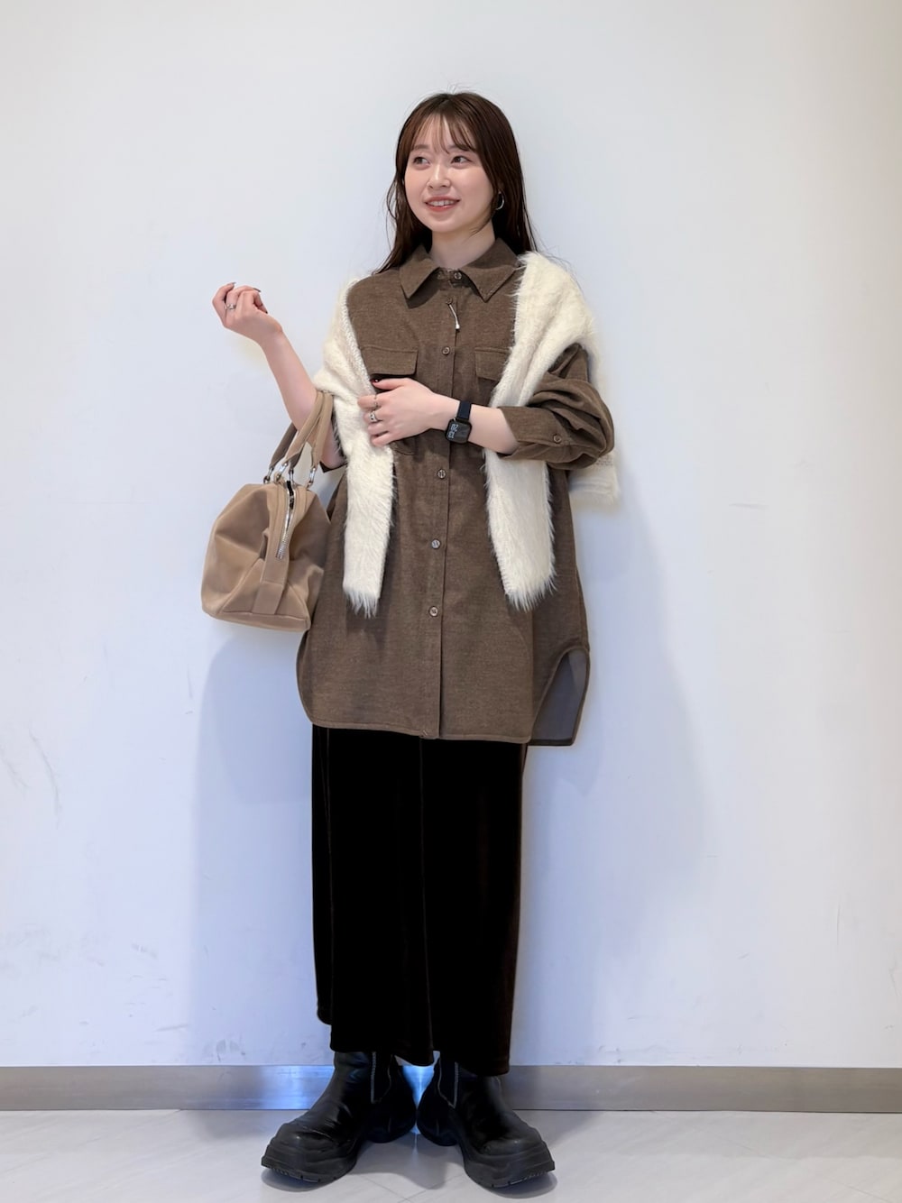 ウールがミックスされているシャツコーデです!! とっても肌触りが気持ちい〜😫 のに、裏地はサラッとしていてレイヤードもしやすい生地感になっております!! お仕事の場でも使っていただけるシンプルさ、なのに素材感が秋冬ムード出してくれるので1枚持っておくと着回しが沢山出来そうです🔥 ベロアのスカートは身長152センチで胸下あたりまで上げてスッキリ履いています! 長めが好きであれば、ウエストで履いてベルトで丈感調節するのもいいと思います👍🏻 是非店頭にてお試しください😆