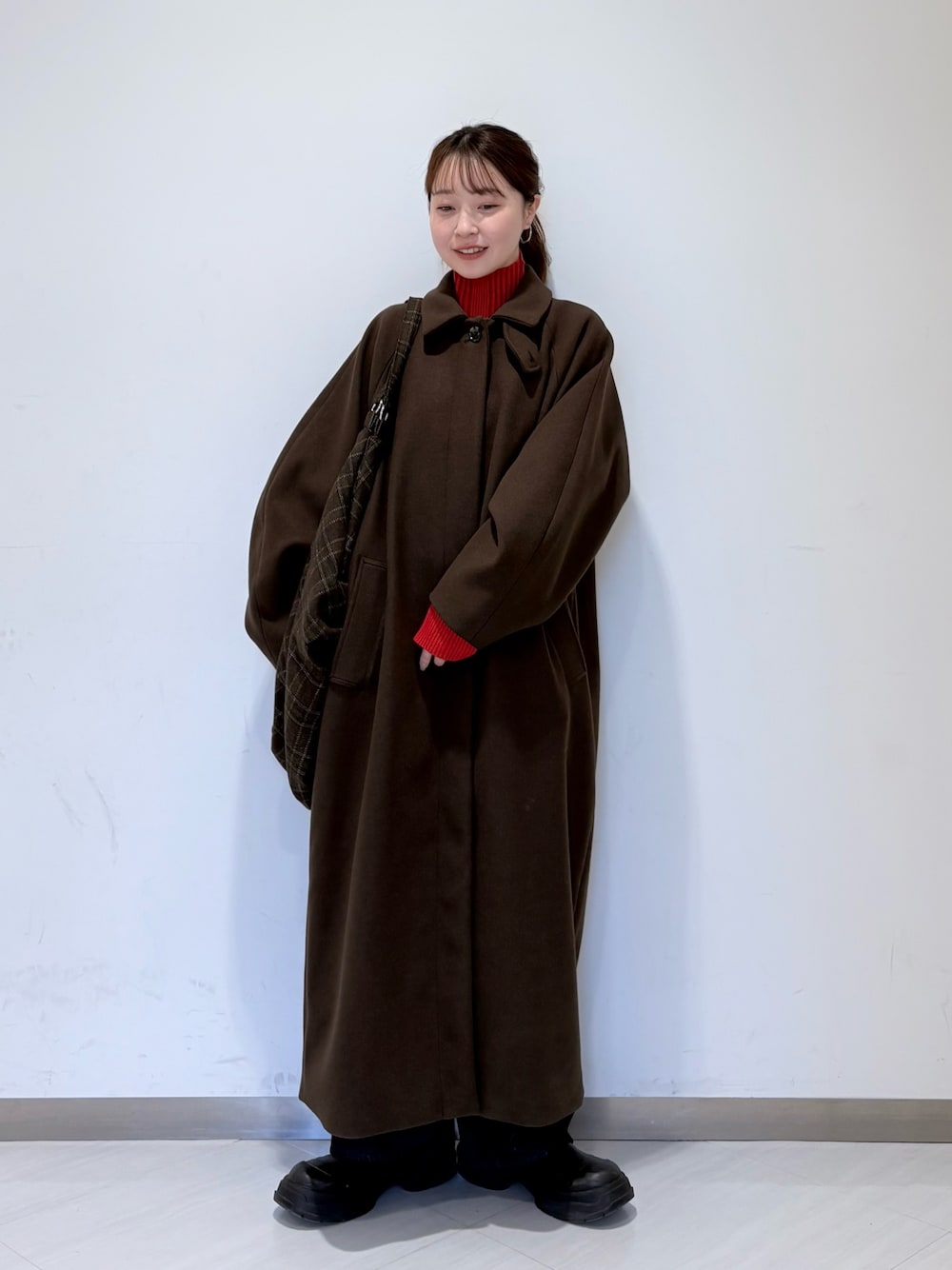 秋冬に差し色の赤可愛いですよね😆 このロングコートのブラウンに赤がとっても合うんです✨✨ タートルはリブがランダムで細見え効果もあります! 袖が長めなのでアウターを着た時も差し色の赤をチラ見せできるのも嬉しいポイントです!! 是非店頭にてお試しください!