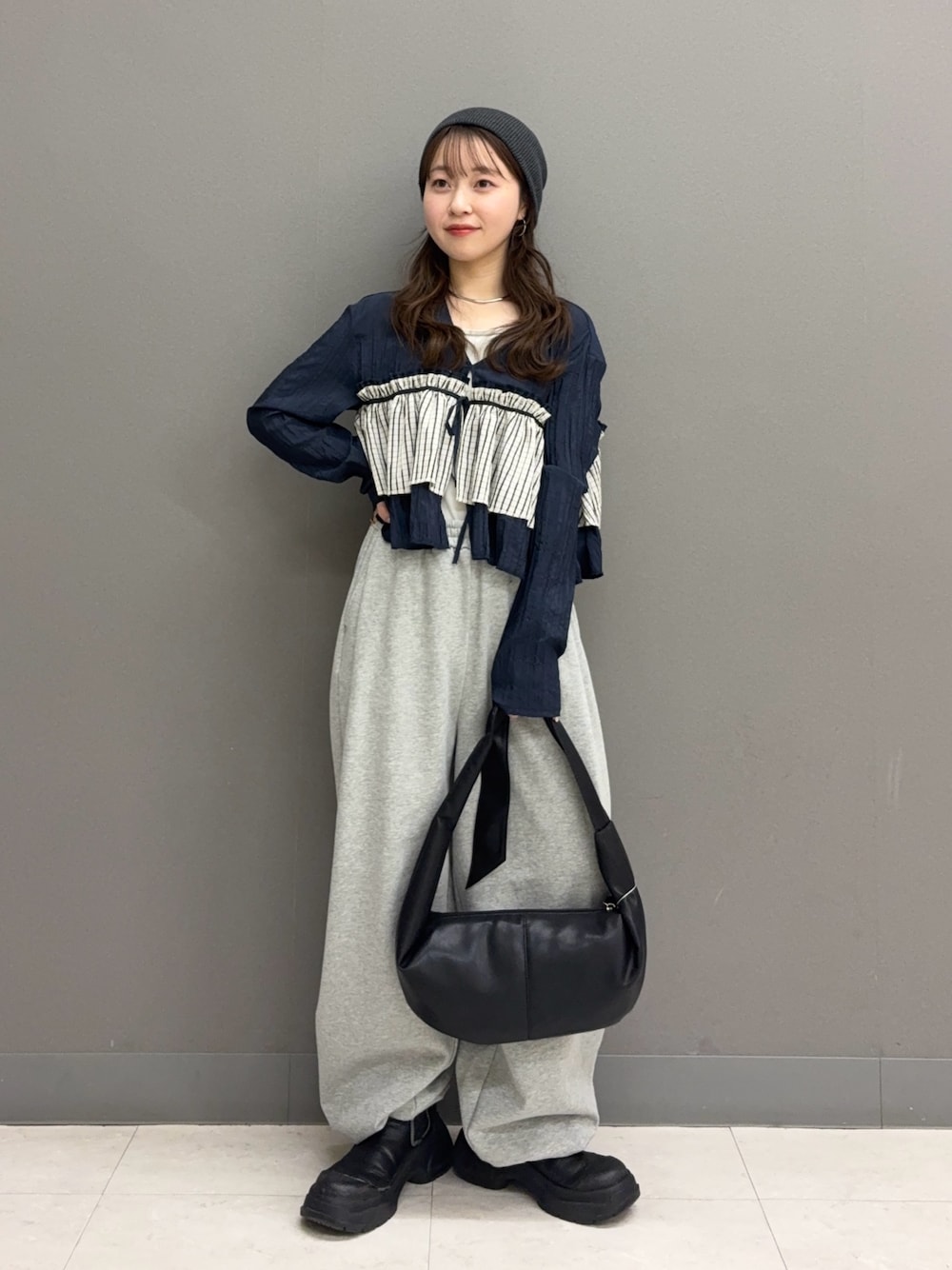 オシャレに可愛く、楽チンに着たいが叶うコーデです!! フリルがレイヤードしてあるブラウスは何にもしなくても1枚でコーデが決まり簡単に可愛いが作れちゃいます☺️ 可愛いブラウスにはスウェットパンツとビーニー合わせでラフに組む事で可愛い系が苦手な方も挑戦しやすいですね✨ パンツは身長152センチでウエストを1回折り返して着用しています!! パンツの裾にはドロストがついているので折り返さずにも履けましたーー!! ストンとさせたい時は折り曲げて、絞る時は折らずに、な感じだと思います👍🏻