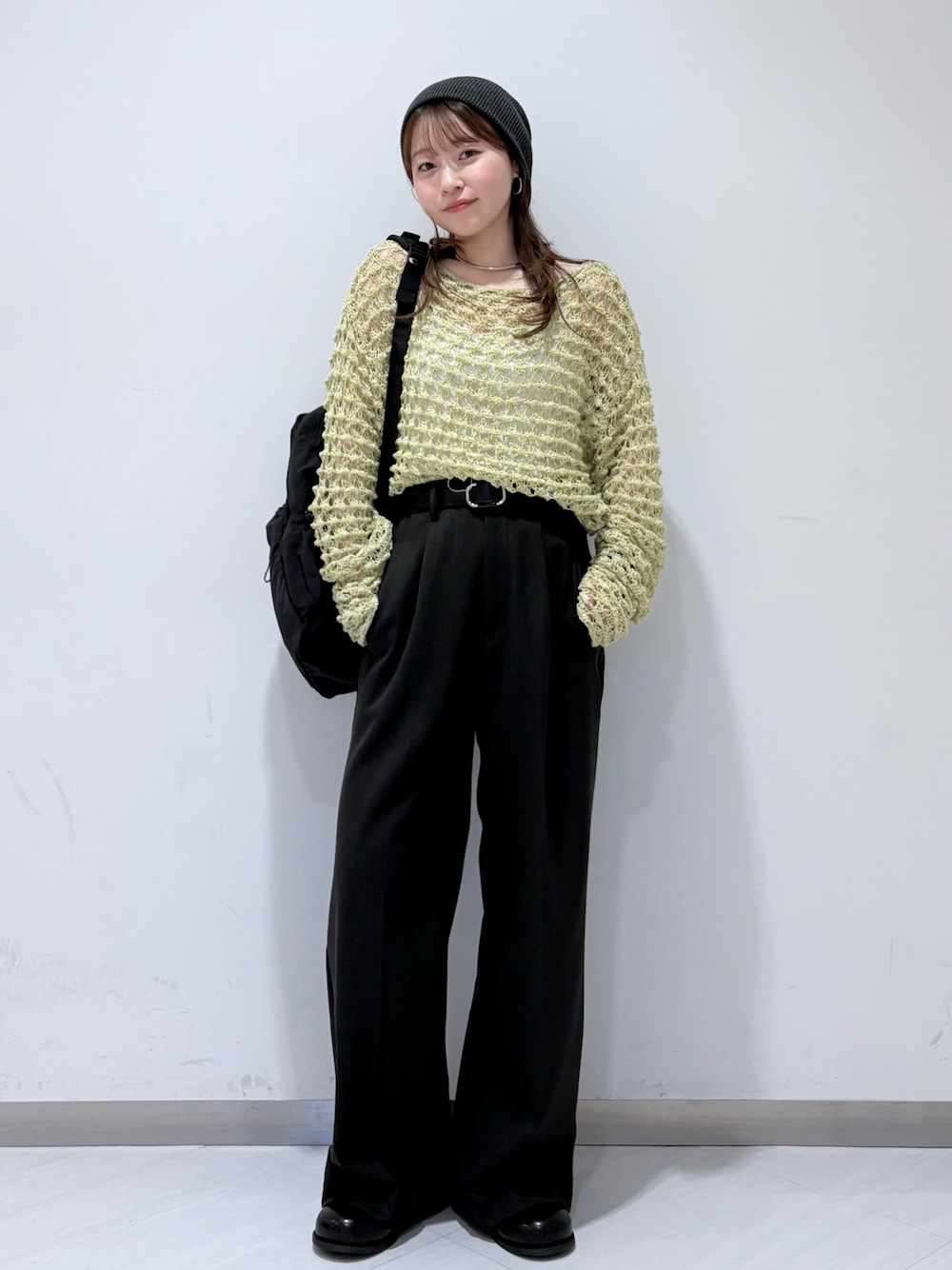 ゆるっとニットにスラックスで大人のリラックススタイルです😎 スラックスにリュックやビーニー合わせでカジュアルに👍🏻 ニットは首周りがゆったりしておりとっても華奢に見せてくれます!! 丈も長めですが、パンツにインしてもごわつかずに着れました! パンツは152センチで36サイズを着用しています! 高さ5センチのミュールを履いてストンとキレイに落ちてくれるサイズ感でした! ペタンコで合わせる時はウエスト折り返すか、丈直しもいいと思います!! 是非店頭にてお試し下さい!