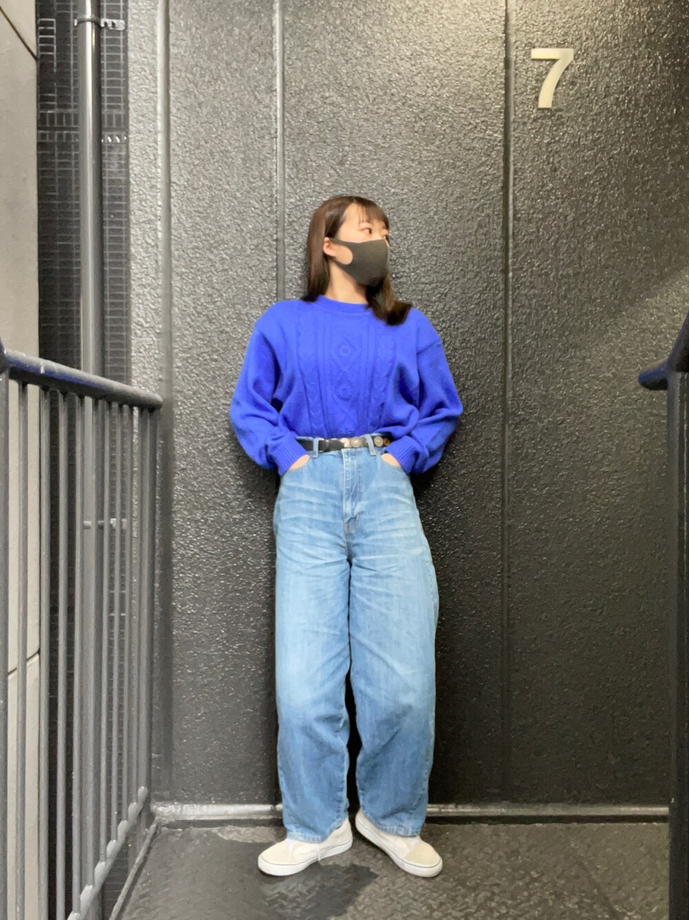 このベルト本当に可愛いんですよ。 コインが並べられたデザインで、めちゃヴィンテージ感溢れてます🤟🏻 でも難点が、短すぎて1番緩い穴で締めてもギリギリなのです。少し太ればもう終わりです。 ブルーのニットはロエコさんで一目惚れ😻 インナーはグリーンに変わりつつありますが、相変わらずブルーで攻めてます🦋