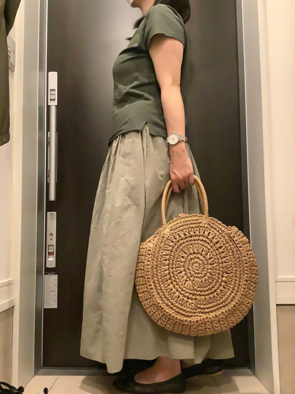 同色系コーデ ボリュームのあるスカートも、トップスに薄手のTシャツを合わせるとスッキリ! ⚪︎tops 無印良品 ムラ糸天竺編みフレンチスリーブTシャツ Mサイズ グレイッシュグリーン 購入価格 990円 ⚪︎skirt classicalelf 風まとう、たっぷりフレアマキシスカート XLサイズ ライトグリーン 購入価格 1499円 ⚪︎bag classicalelf 2way無地ラウンド型サークルかごバッグ 購入価格 1535円 ⚪︎shoes GU ストローバレエシューズ Lサイズ BLACK 購入価格 990円