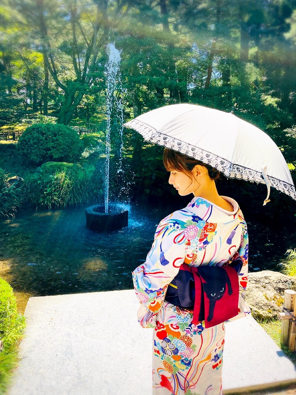 可愛いお着物を着せてもらいました👘 華やかな柄の着物と猫ちゃんの半幅帯がポイント🐈 襦袢、足袋、日傘、バッグを含めて全てレンタルしてもらえます◎ 追加料金でヘアメイクもしてもらえるので、可愛さ100点で街歩き出来て幸せ🤤💓💯