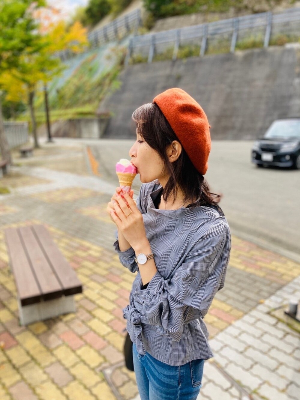 秋コーデ🍂 グレンチェックのトップスとベレー帽で秋らしさを出してみました 体温調節しやすく、動きやすいところも◎ おばあちゃんに作ってもらったババヘラと共に🌹