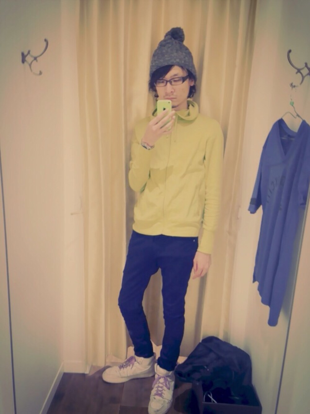 イエロー系のパーカー、ブルー系のその他パンツ、ホワイト系のスニーカーを着用したメンズの春コーディネートの1枚目の写真