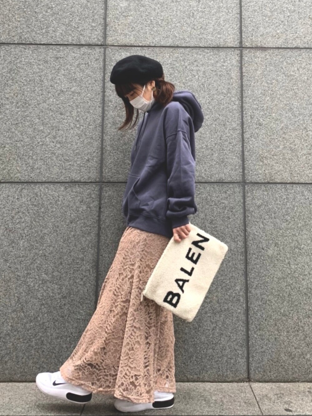 キレイめレーススカートもパーカーを合わせたら大人カジュアルになって着回しの幅が広がるからパーカーは必須アイテムです!何度も言うけどこのスニーカーは楽過ぎる👟大人の味方…