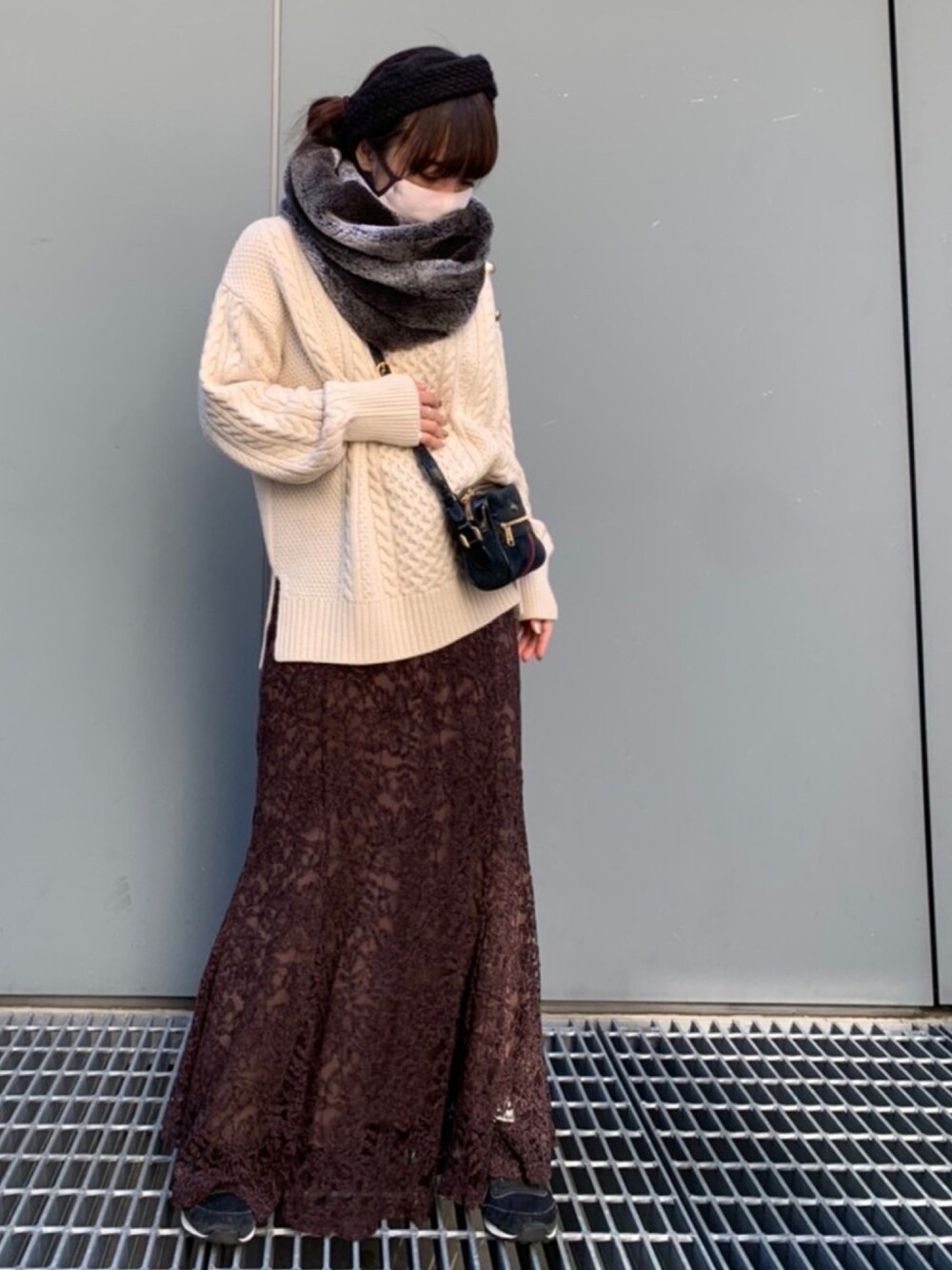 スヌードって結ばなくていいから楽ですよね。これは触り心地も良いしもう一度販売して欲しいな🥶スカートは大人気のベロアレースのスカートです。シルエットが本当に綺麗でおちびもスタイル良く見えるのでお気に入りです🥺