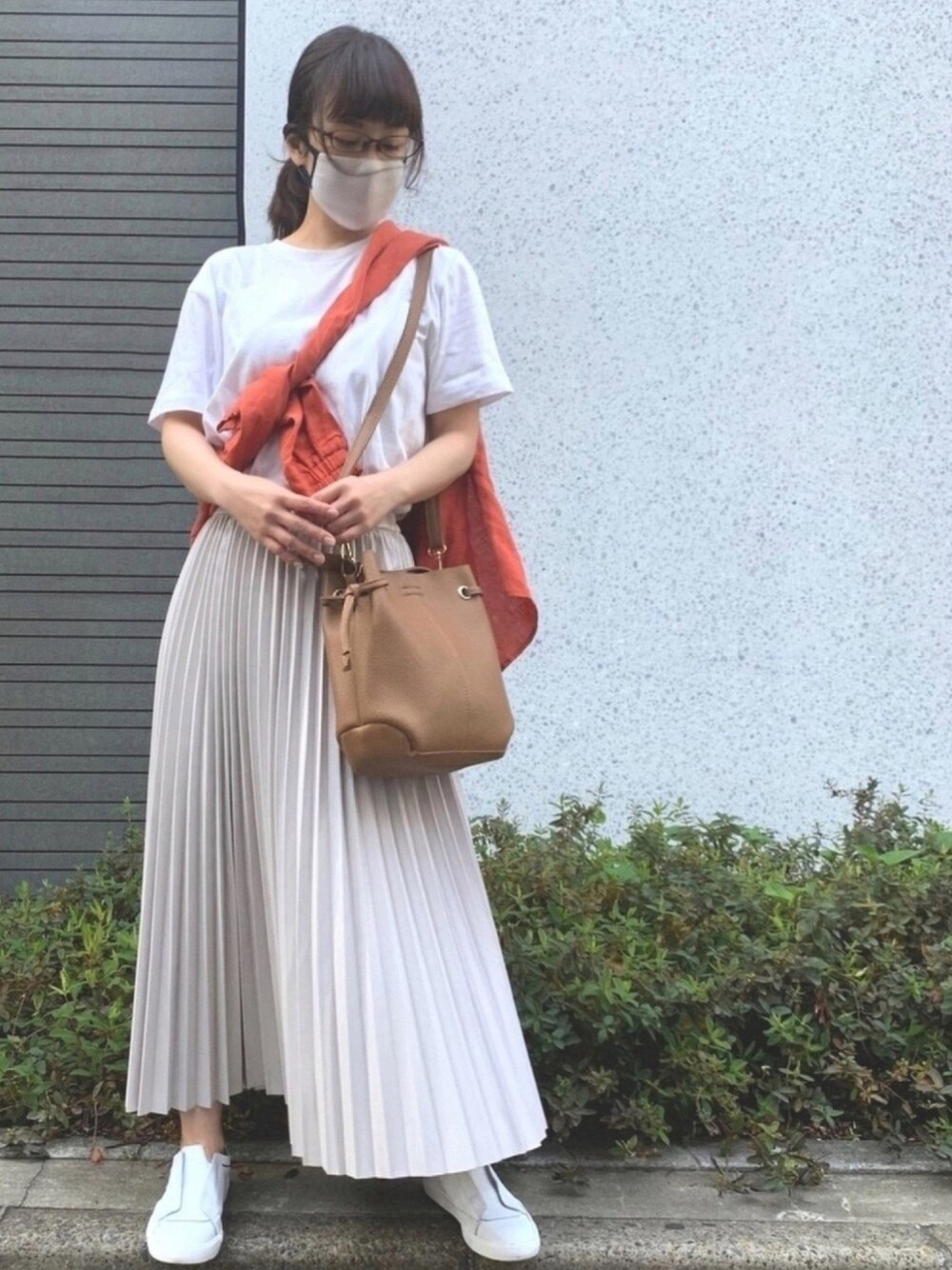 プリーツスカートにTシャツインはおちび安心のコーデです。差し色の羽織シャツは今年らしくたすき掛けで。