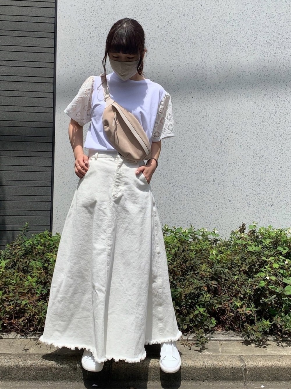 夏のホワイトコーデ✨ 同じ白じゃ無くて色んな白を組み合わすのが好き❤︎Tシャツも袖がレースでカジュアル過ぎない感じがかなり👍