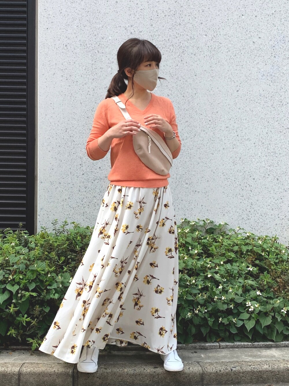 薄手の春ニットは夜に冷え込む日には丁度良いアイテム。春カラーだから新鮮だし、電車の冷房で冷え切る私には大活躍です! トップスはコンパクトなので、スカートにボリュームたっぷりの花柄で更に春気分に🌸