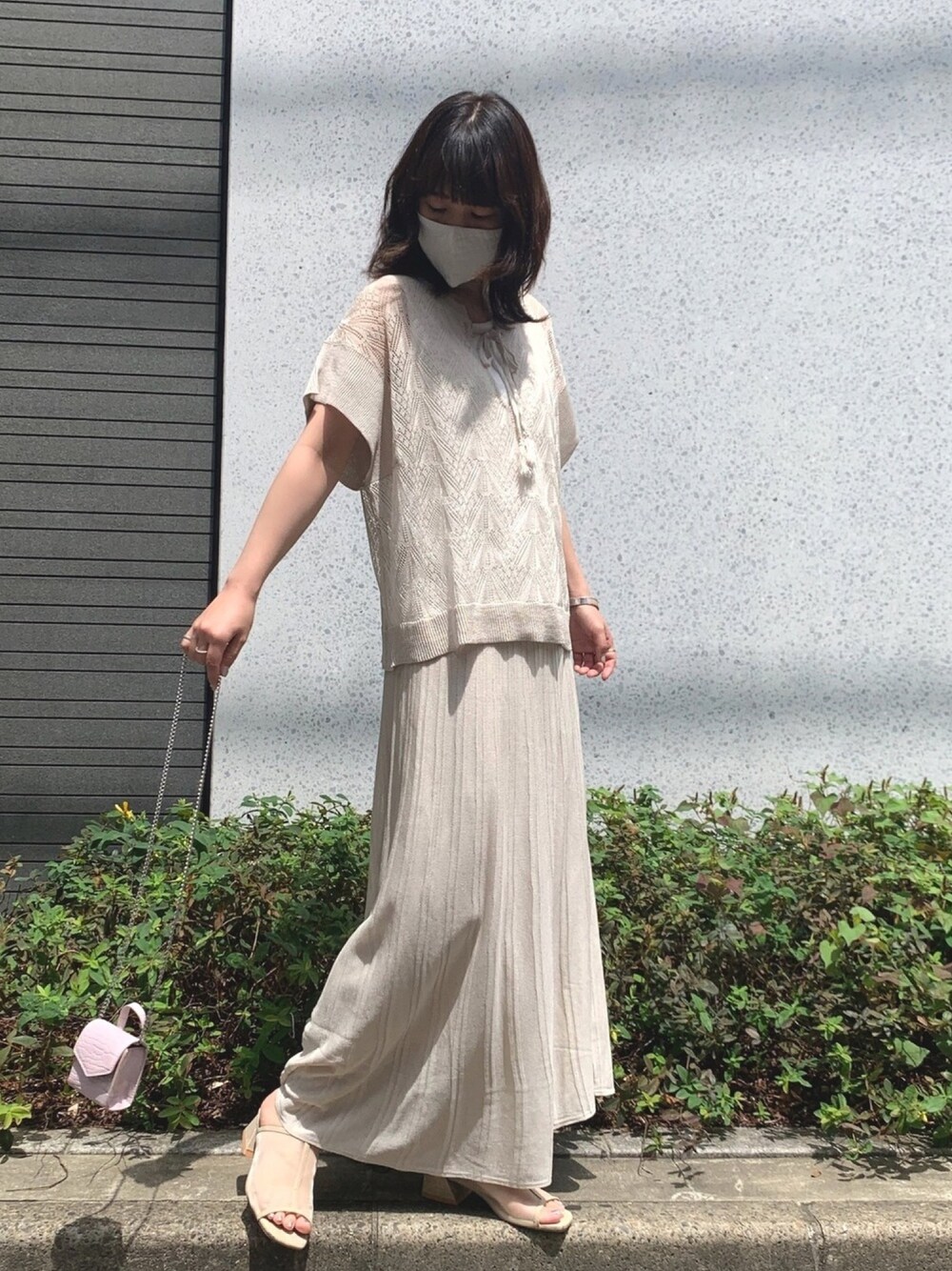 バッグの持ち方は散歩スタイルが好きです🐕透かし編みニット見た目も可愛いのには肌触りも通気性も良いのでついヘビロテしてしまいますね❤︎