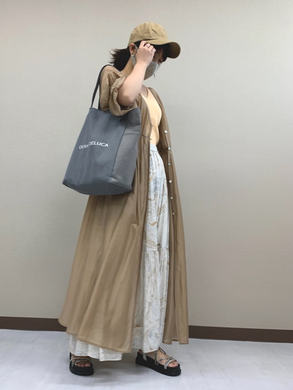 日差しが強すぎて腕が直接出せないって時に薄手羽織が活躍します! キャップとトートでカジュアルダウン♪