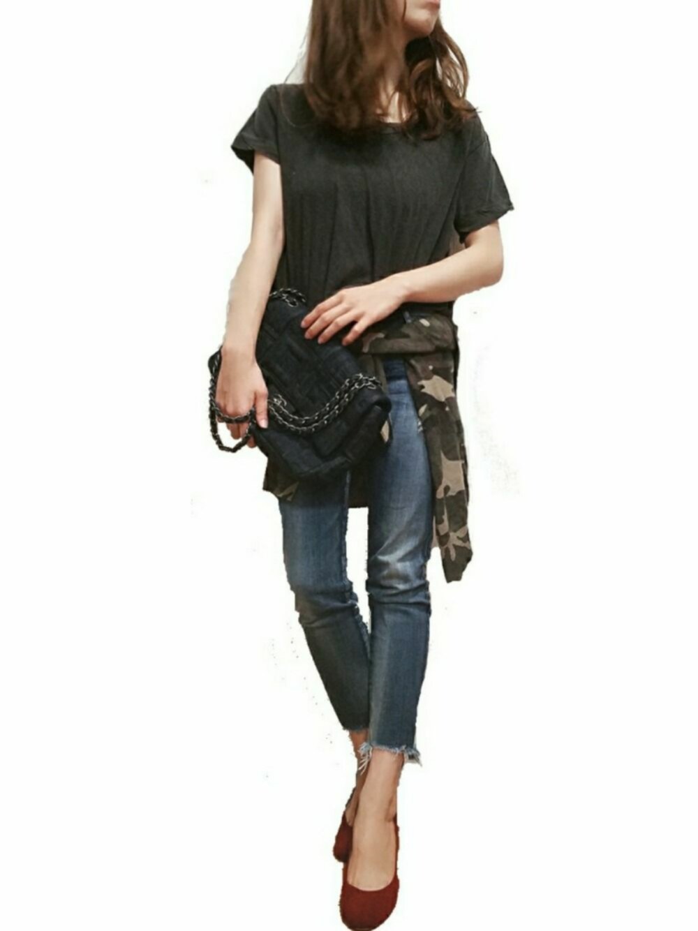 お気に入りのデニムと、シンプルだけど ディティールが美しいTシャツの組み合わせは それだけでテンションがあがる! このデニムはストレッチが効いてて 息子と遊ぶときも楽なのにシルエットきれい。 バックもデニム地でとことんカジュアル。 カジュアルでも足元はヒールで女らしさは忘れずに!