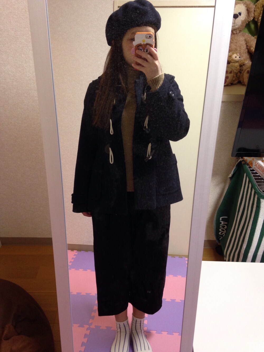 コート: earth music & ecology ニット: UNIQLO 靴下: 靴下屋 ベレー帽: ? このダッフル、フリマに出してたけど やっぱり自分で着ようっと!