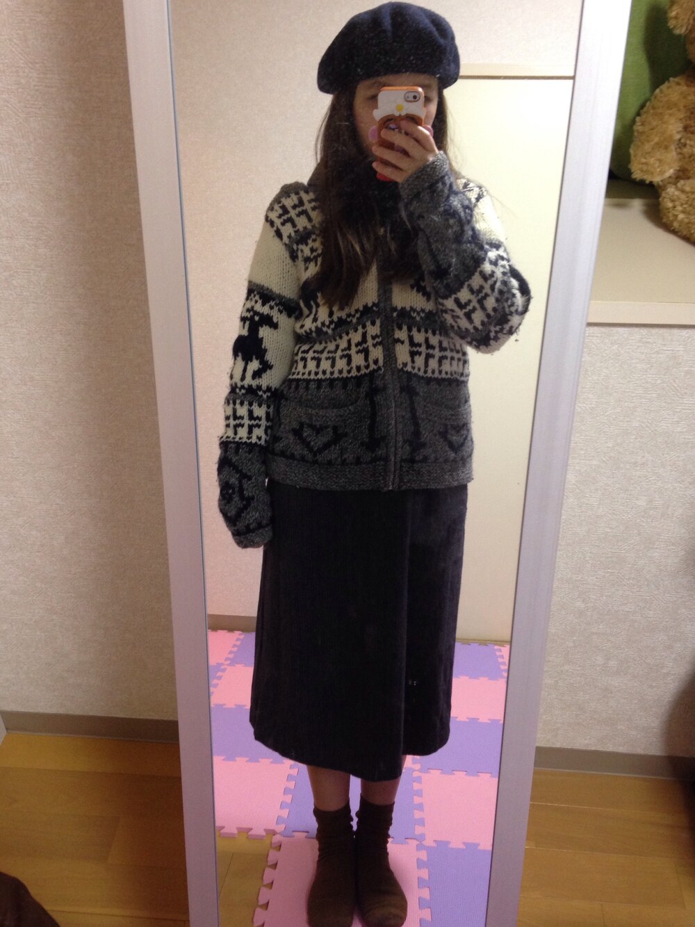 ベレー帽: ? アウター: cepo トップス: UNIQLO スカート: 古着 靴下: 300円ショップ このアウター1年?2年?ぶりかに着たー まだ付き合ってた時に 誕生日プレゼントに買ってもらったやつ。