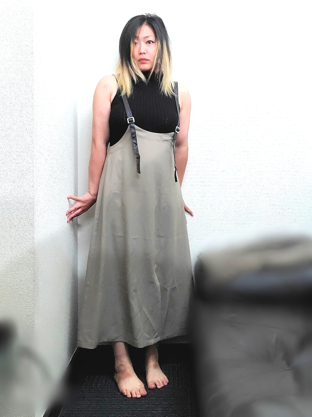 茶みこのジャンパースカート「【WEB限定】レザー配色ジャンパースカート」を使ったコーディネート
