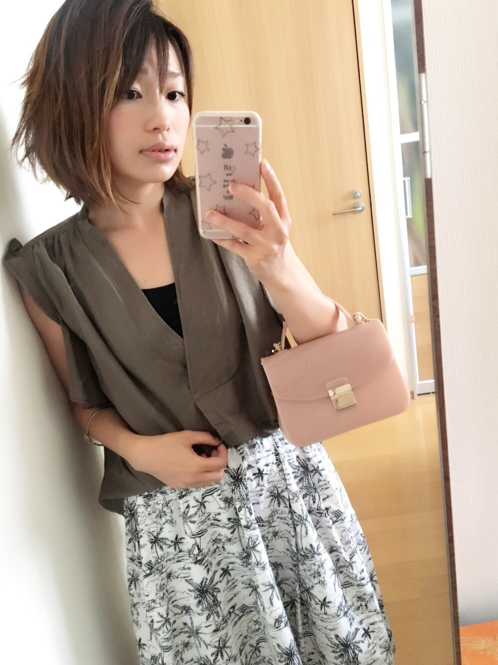 アロハ柄のスカートで夏気分。 今日はこのあとデニムに着替えて庭でトマトの苗と戦っていたら、 ものすごい日焼け&身体が緑色になっちゃいました😂😂😂