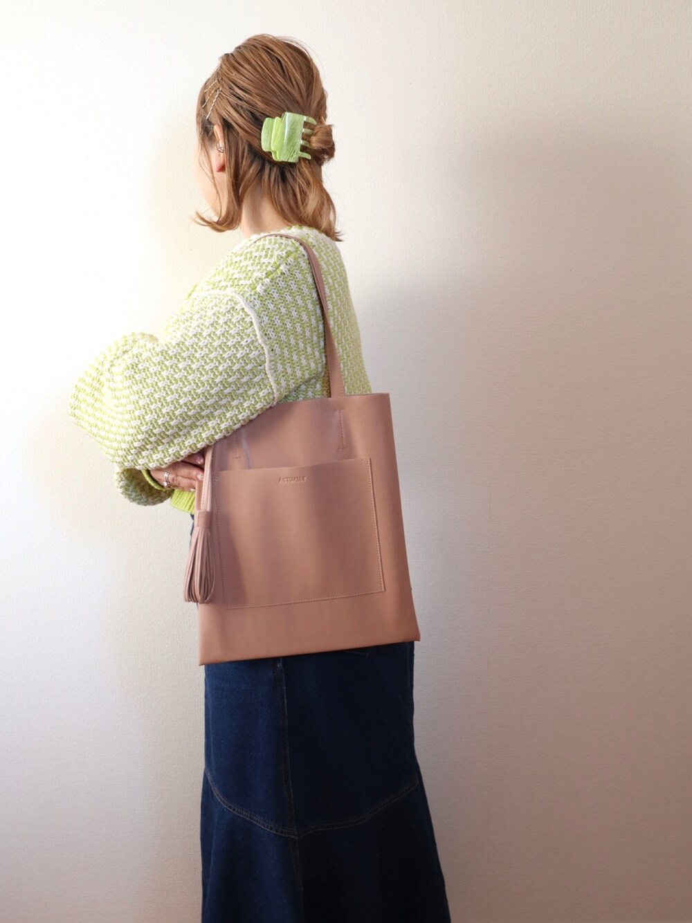 ちゃみまる🐶(BIRTHDAYBAR&KITCHEN 名古屋ラシック店)のトートバッグ「【一部店舗限定色】ヴィーガンレザー(人工皮革)フラットトート」を使ったコーディネート