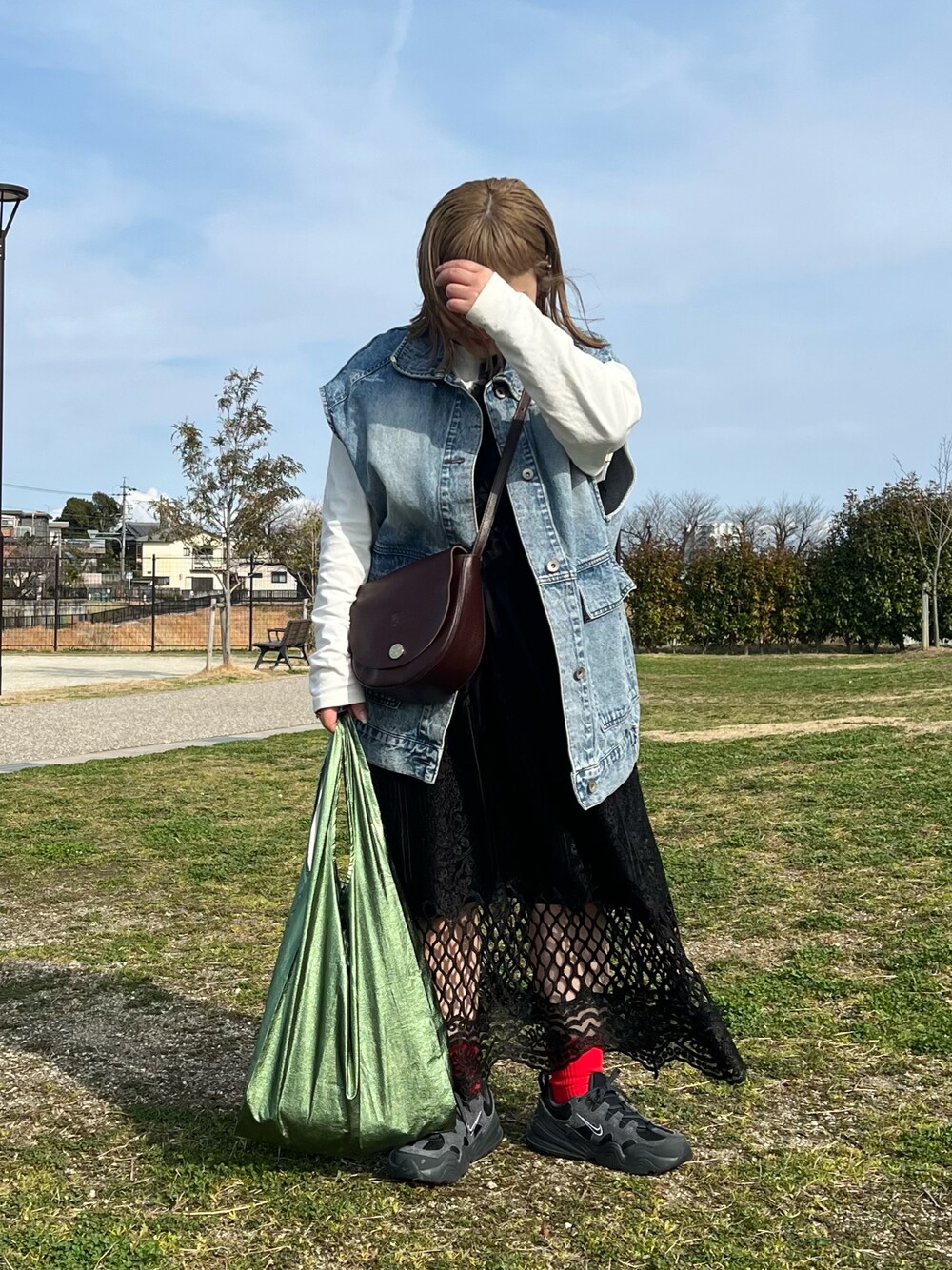 奇跡的に暖かかった日のコーデ🌞 ロンT1枚で余裕だったな〜 いざという時めっちゃ便利なポーチ付きの エコバッグ✨ オシャレだから気に入ってる🦖💚