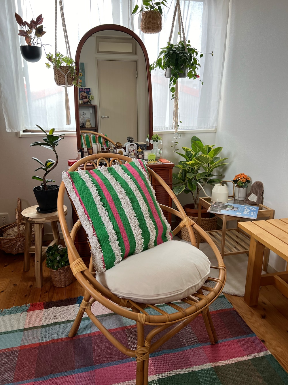 新しく買ったラタンの椅子にお似合いすぎる クッション🩷💚フリンジがポイント! めちゃくちゃお気に入り🫰🏻