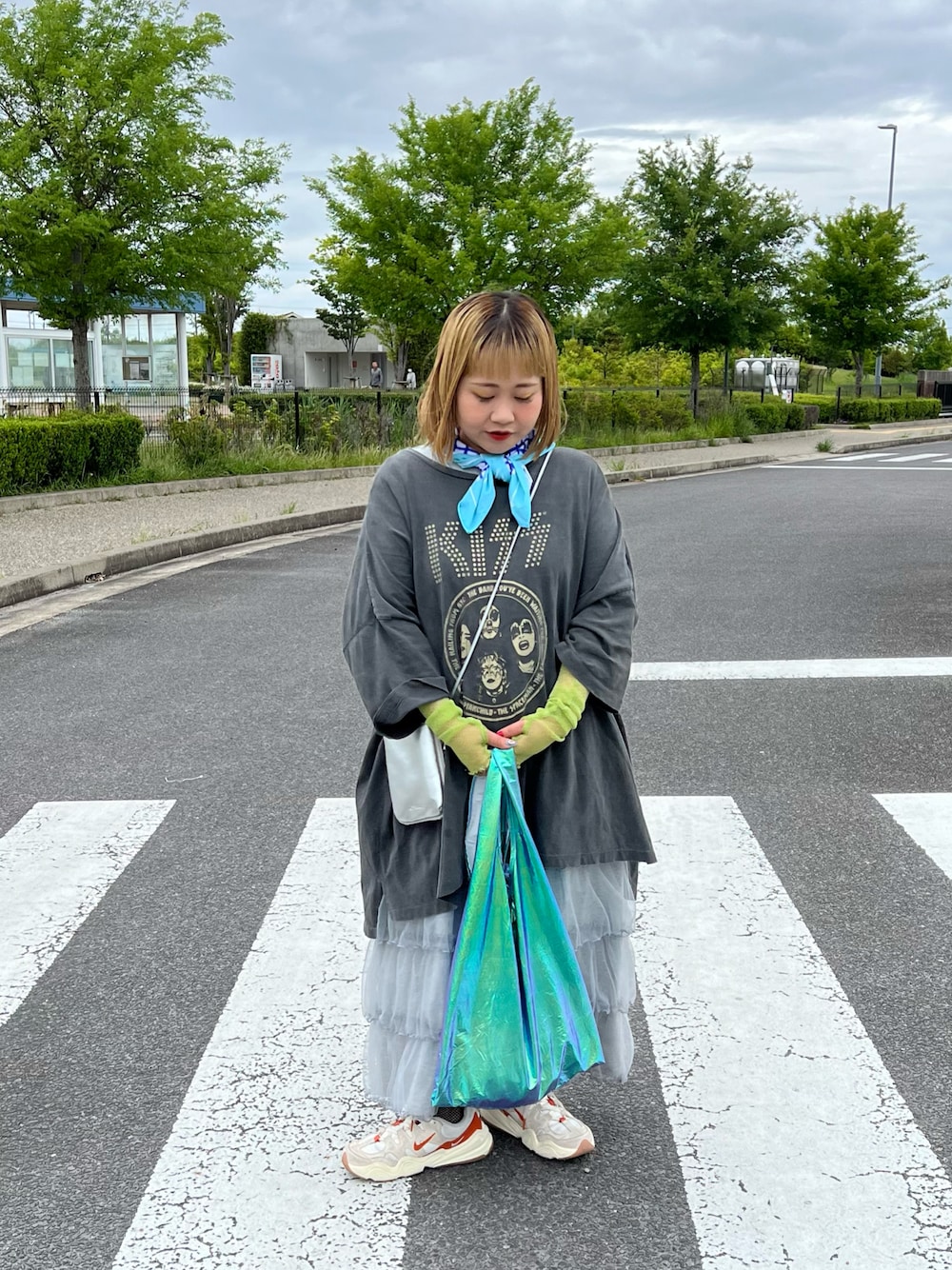 スカーフは接触冷感タイプでひんやりするので オシャレしながら暑さ対策できるの最高🌞 スカーフと色を合わせたメタリックな サブバッグも可愛くてお気に入り🩵