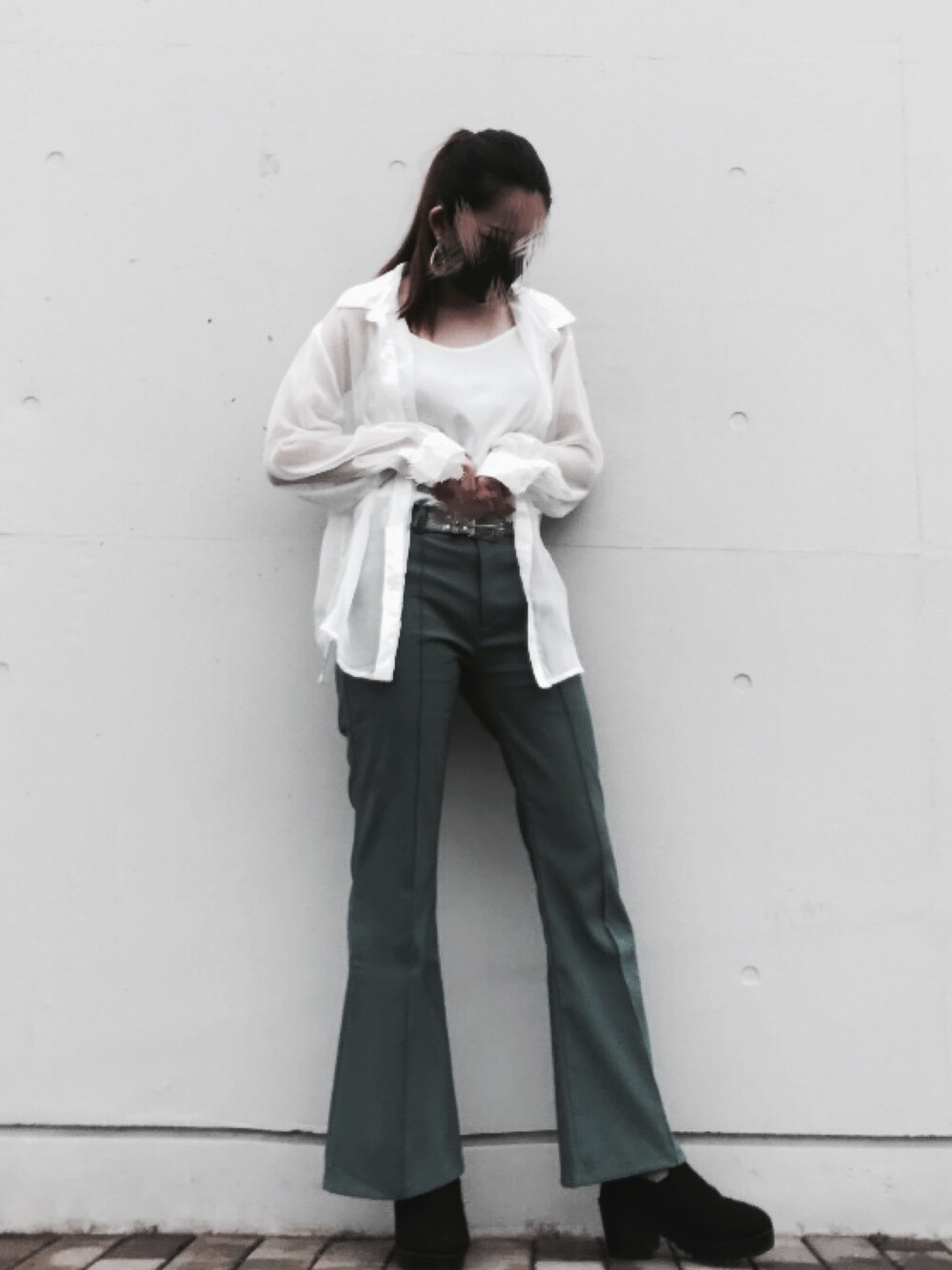 シアーシャツに、グリーンのフロントタックフレアパンツを合わせました☺︎フレアパンツなので足が長く、細く見えておすすめです!シアーシャツは、透け感結構ありますが、寒過ぎずちょうど良いです!プチプラ最高です☺︎