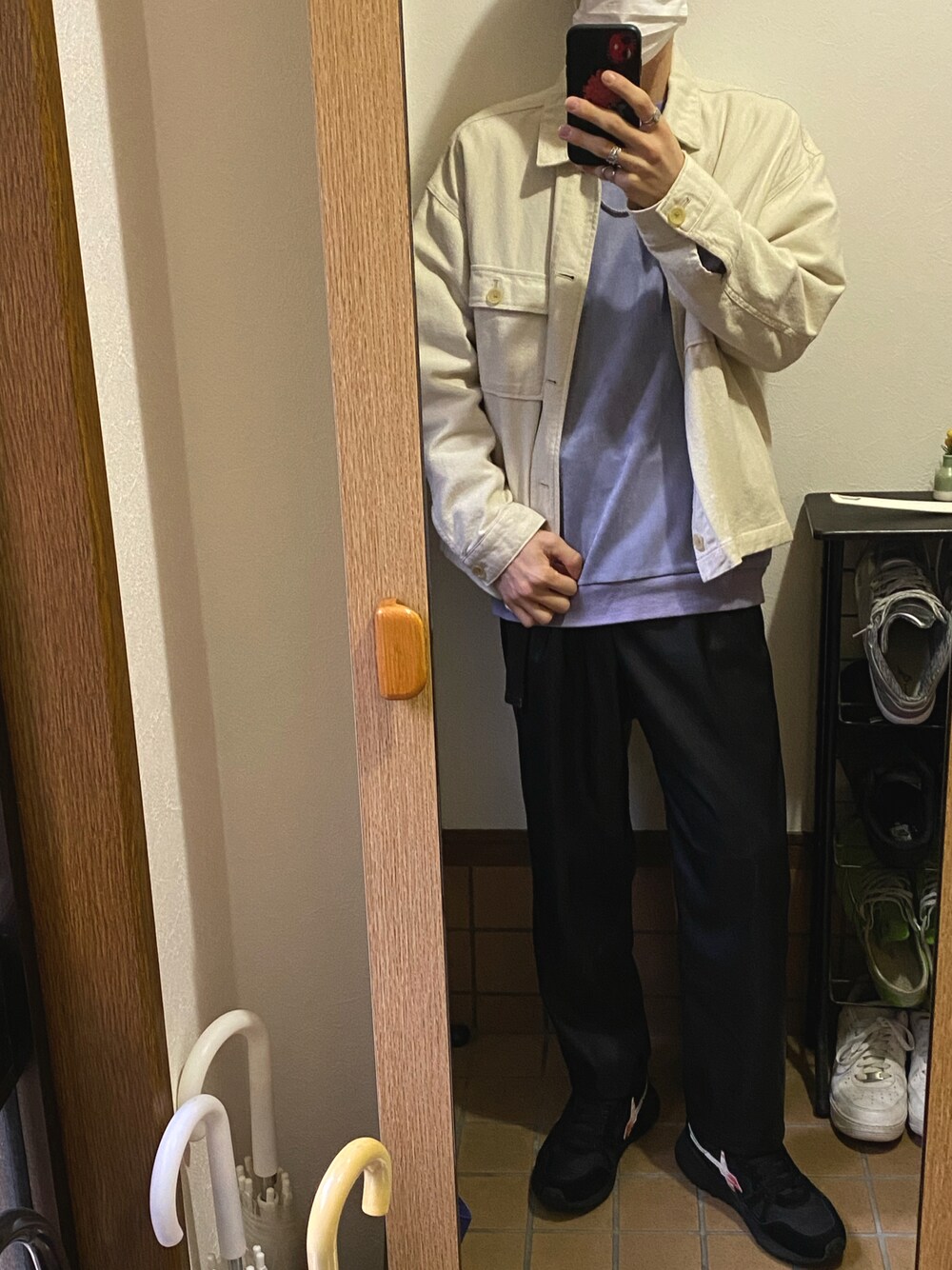 レイジブルーのCPOジャケット レイジブルーのスウェードクルーネック WYMのフェイクレザーパンツ ディッキーズのベルト w6yzのスニーカー 靴下は101匹わんちゃん