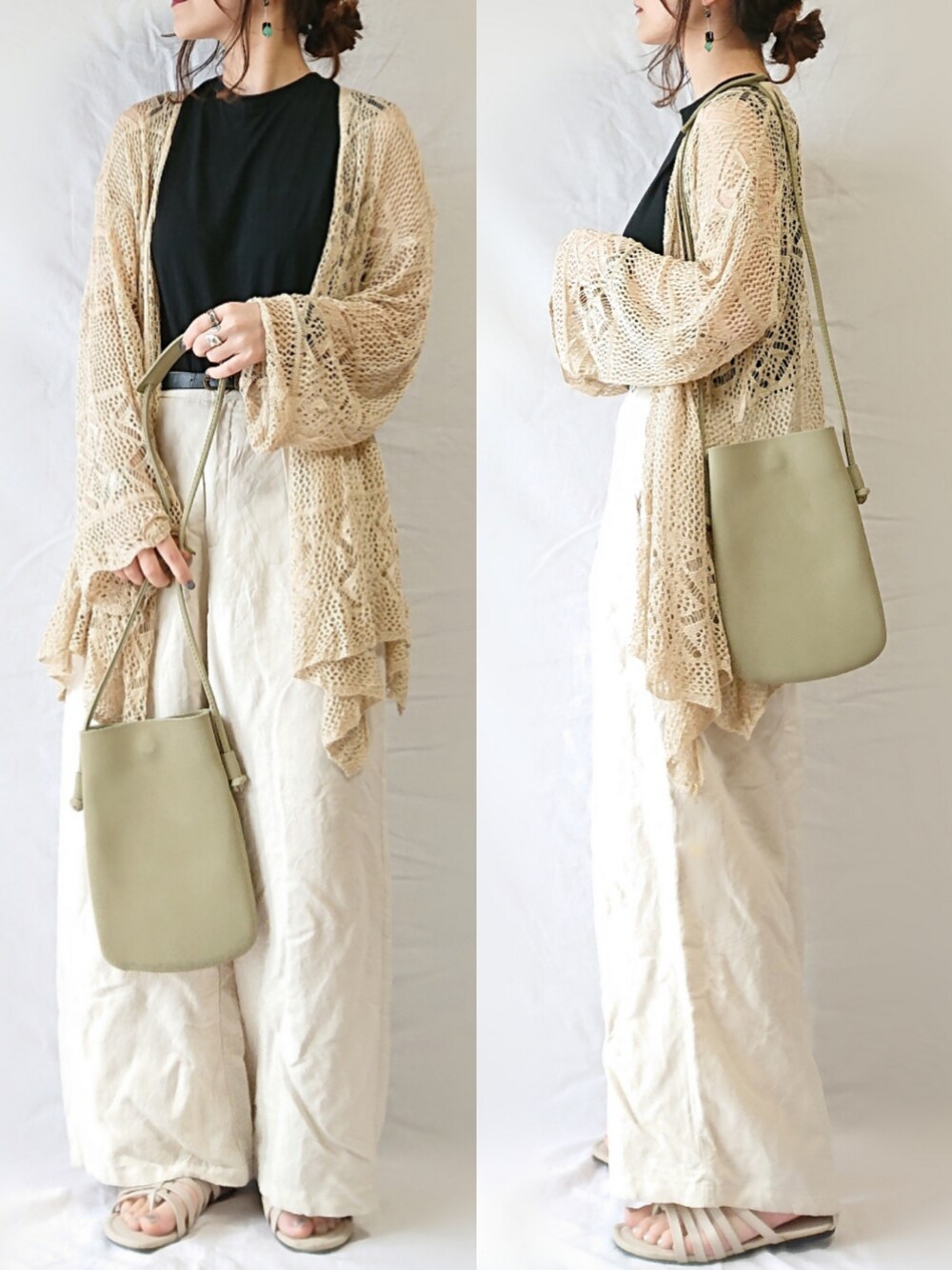 大人カジュアルコーデ\(◡̈)/ かぎ編みのゆるカーディガン可愛い( ˙꒳˙ )♡♥ トレンド感たっぷりなライトグリーンのスクエアバッグも、ベージュ×ブラックに映えて◎! minne💍SO by SOA.RU Instagram📍chamu_wear