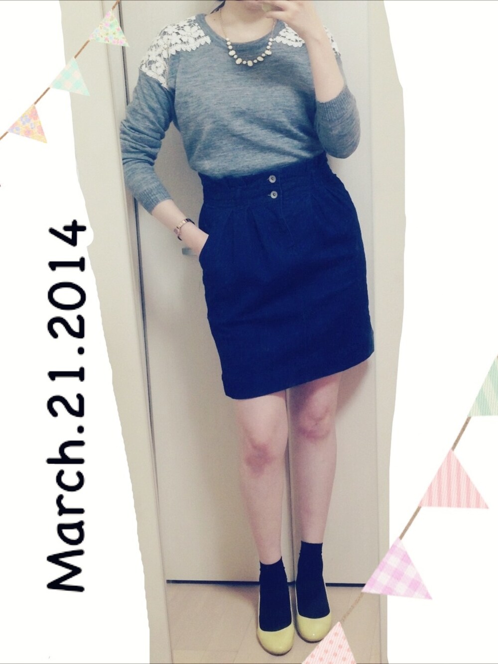 ニット/mystic デニムスカート/w closet 靴下/3coins 靴/ORiental TRaffic ネックレス/LOWRYS FARM 今日は寒かったので、コートは冬モノでしたぁ〜(´Д` )