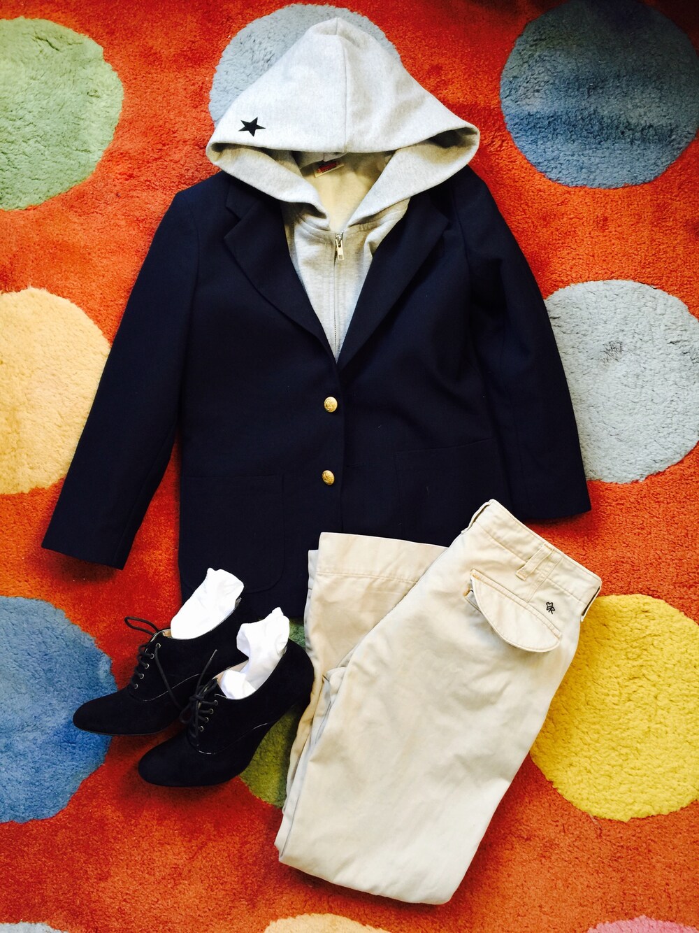 紺ブレ+パーカーでスクール風 パーカーは袖が短めだからキッズサイズの紺ブレにぴったり。 コンパクトにまとまるから紺ブレでもかわいい感じになります。 チノパンはクロップドで少し素足が見えるからこの時期ボディクリームは必須です。 これから代官山でランチ❤️