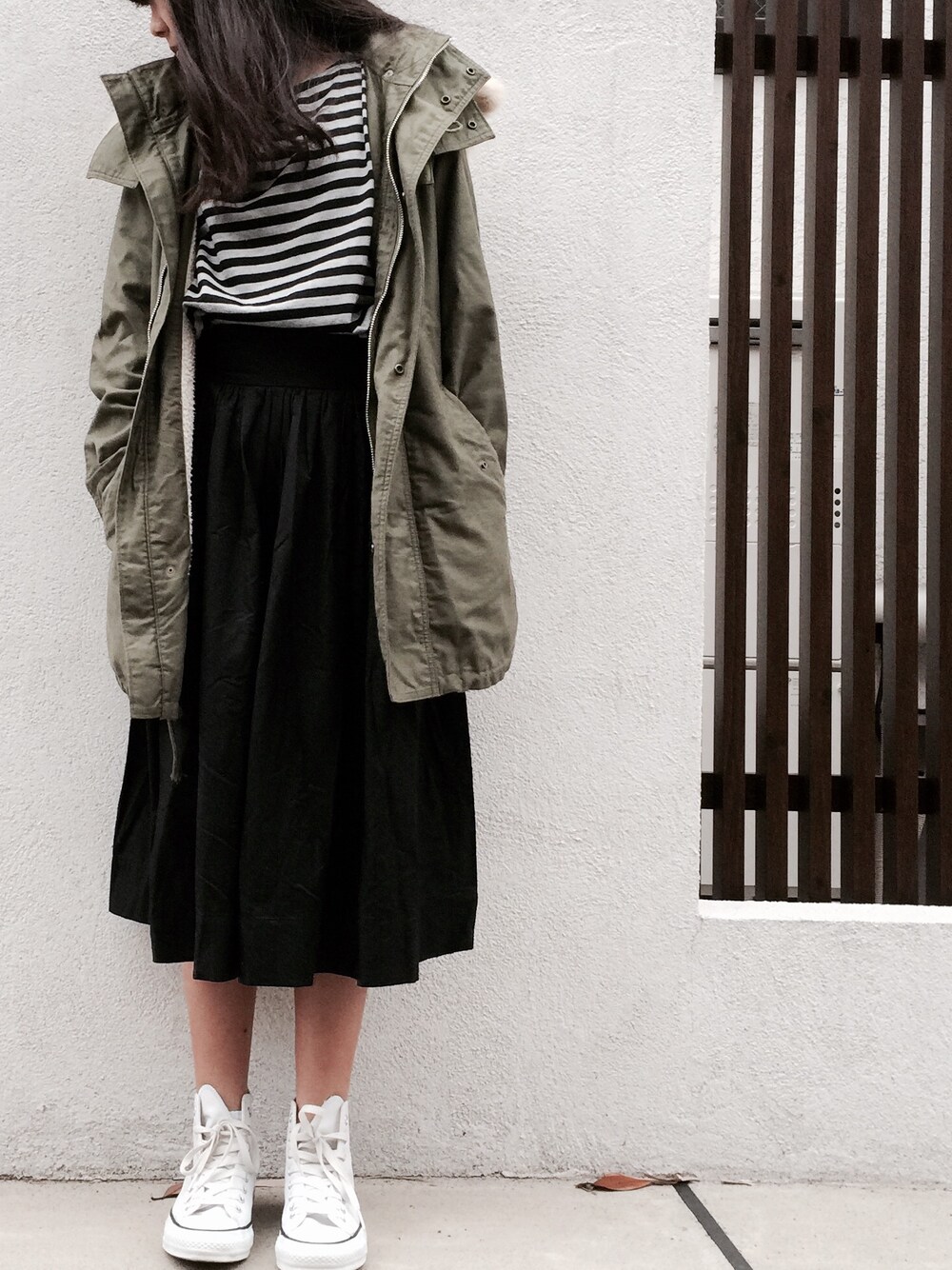モッズコートはなんでもあわせやすいから今年も大活躍です。 ボーダーカットソーはインしてきるのが気に入っています。 中目黒のアウトドアショップbamboo lunaとironyのコラボのモッズコートは後ろプリントがスペシャルかわいい。