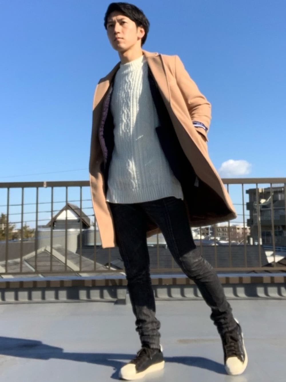 チェスターコートスタイル 今日は北風が強く吹いてとても冷えましたね 今回はキャメルカラーのチェスターコートをメインに綺麗めで合わせました とても寒かったのでセーターにウルトラライトダウンを着込み防寒対策はバッチリ ブラックのパンツ×ブラックのスニーカー 同系色カラーで合わせることでスタイルアップに繋げました 別スタイルもアイテム欄に載せてます ぜひ参考にしてみてください 皆さま風邪などひかないように、暖かな格好でお出かけください