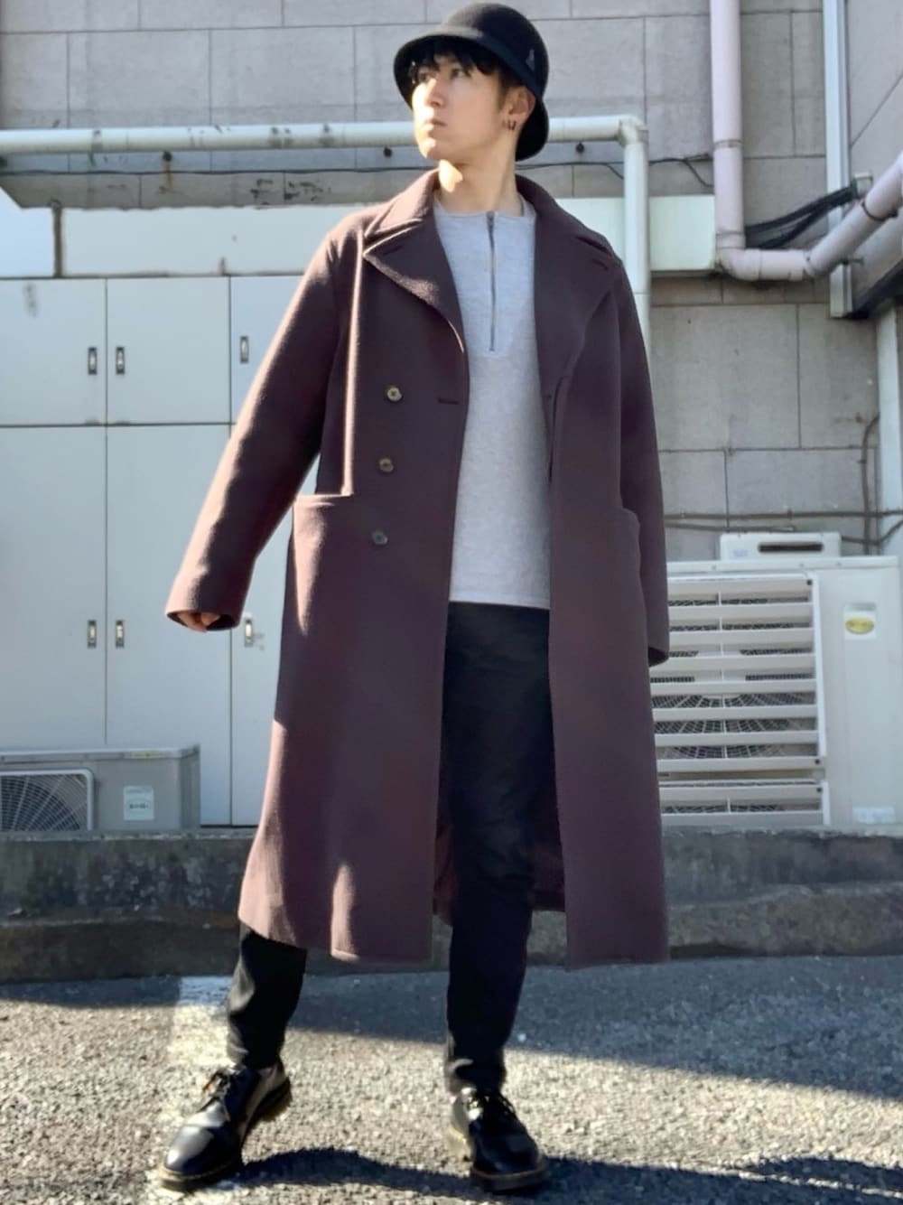 ハット/kangol ピアス/GARNI チェスターコート/LIDNM スウェット/maison margiela パンツ/DIESEL 3ホールブーツ/supreme × dr.martens