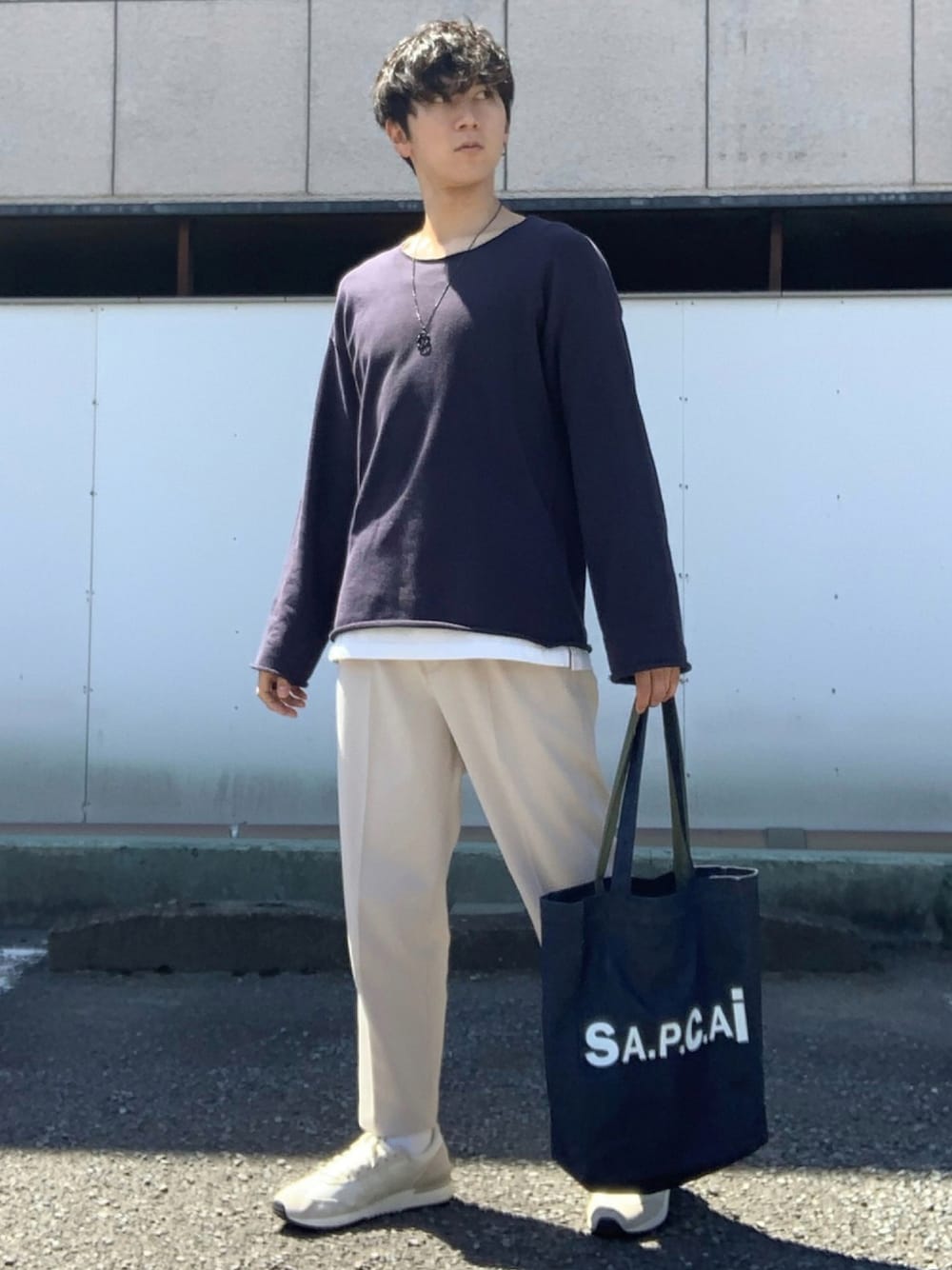 ピアス/LIDNM ネックレス/lad musician サマーニット/N.hoolywood タンクトップ/LIDNM トートバッグ/sacai × a.p.c パンツ/LIDNM ソックス/UNIQLO スニーカー/onitsuka tiger