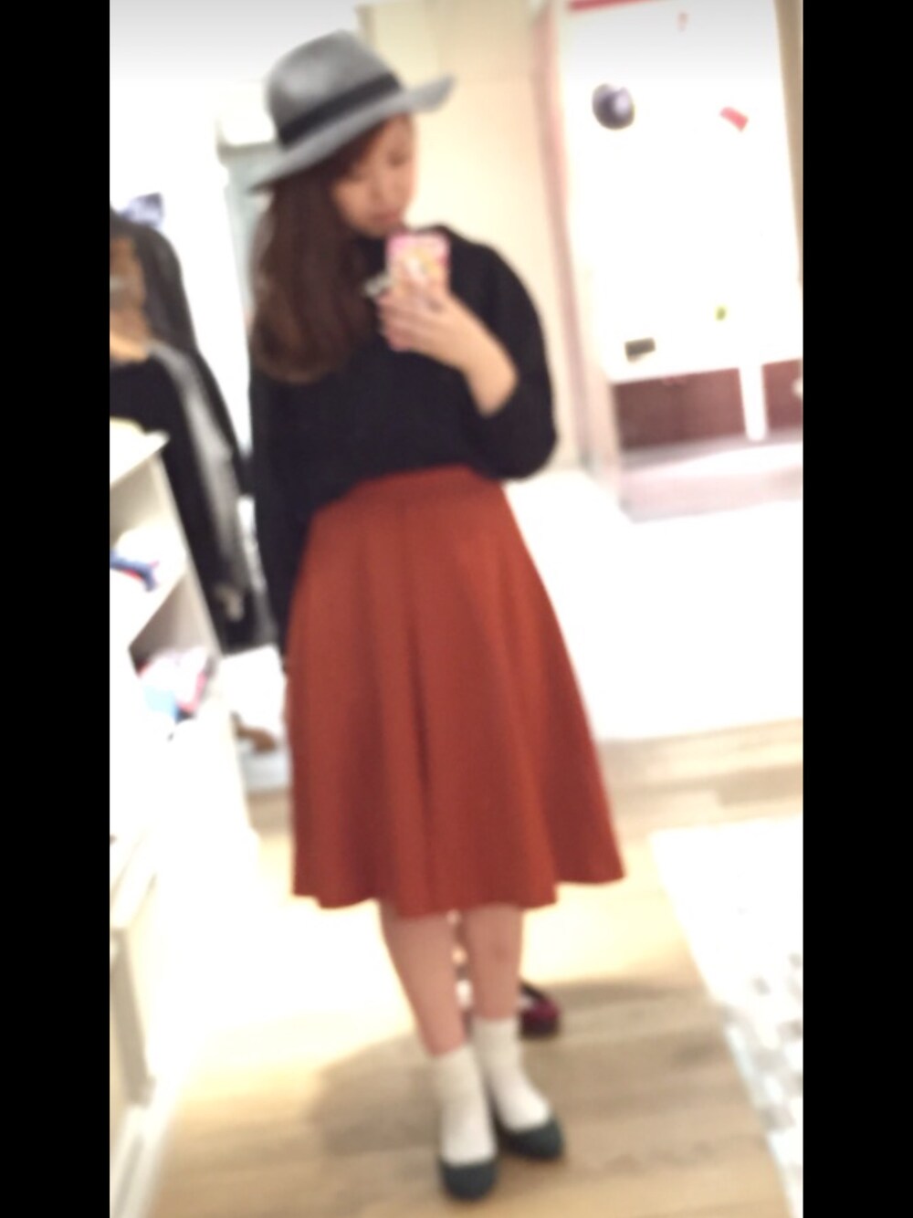 * クラシカルレディ * どこかレトロな雰囲気を 出してくれる渋めオレンジ。 ゆるシルエットなトップスを ブラックで引き締める。 ヒールとハットで身長を盛る おチビたん。笑