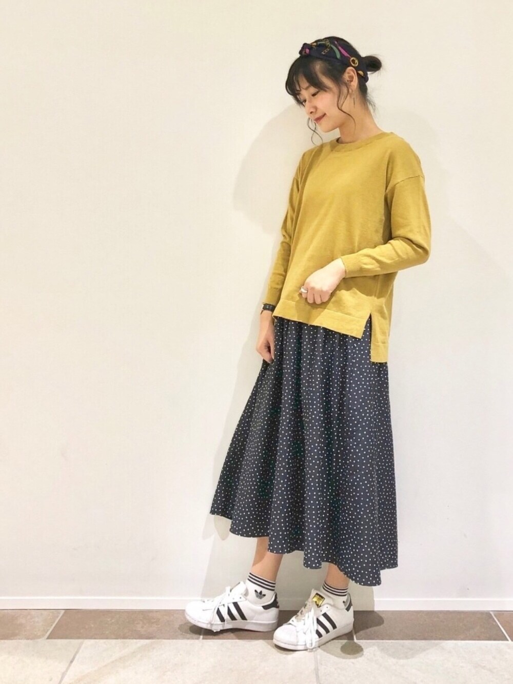 ドットのフレアスカートは マスタードのトップスと相性◎ 春らしいコーデ🌸