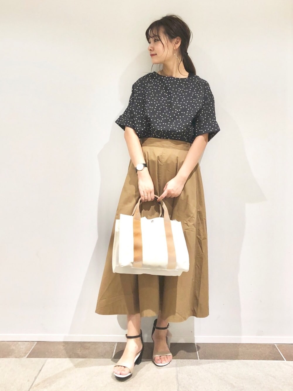 ブラックのドットブラウス キャメルのスカートとの相性抜群👯♀️