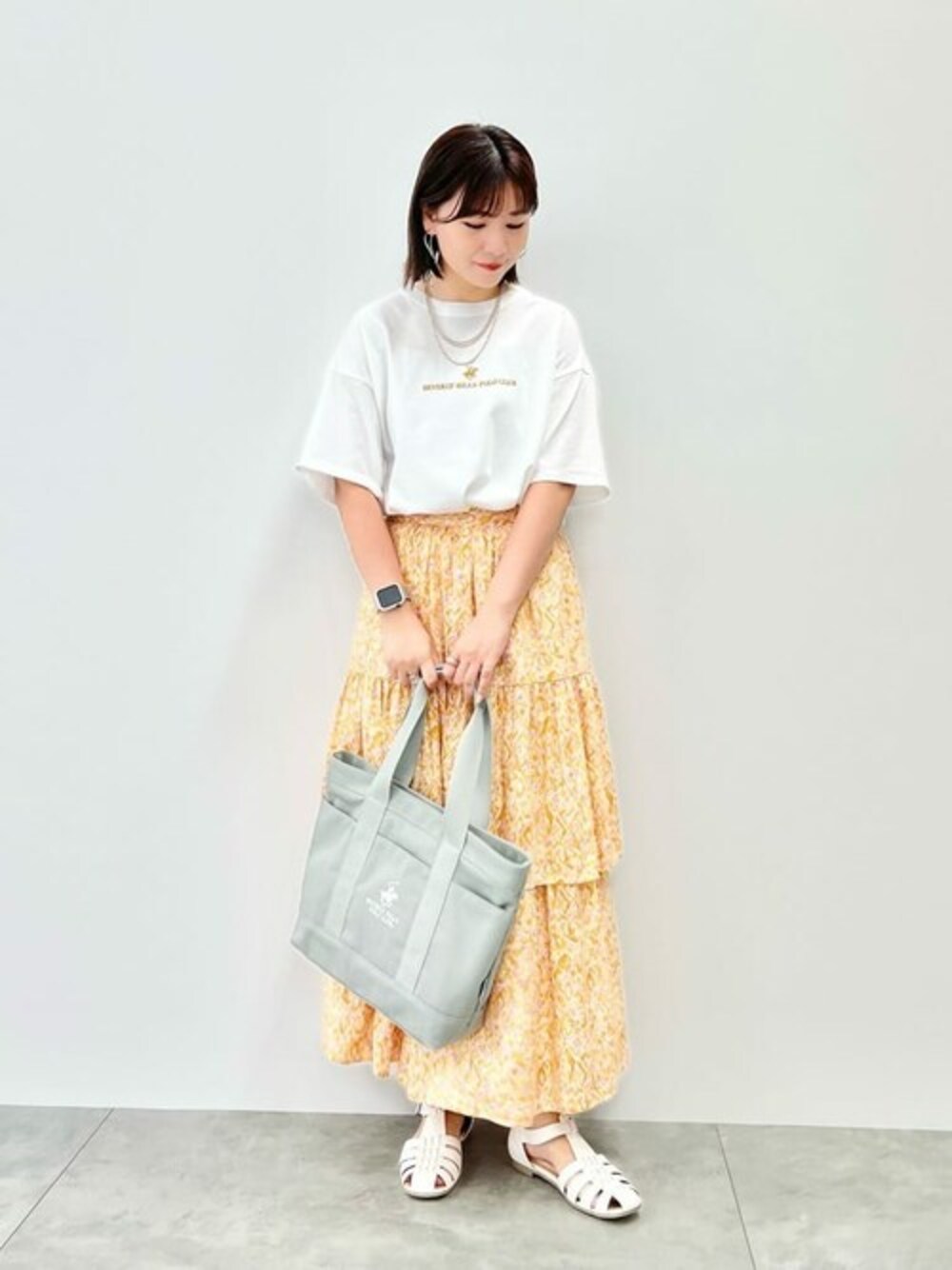 エスニック風のスカートで夏先取りコーデ POLOのTシャツは ゴールドの刺繍がオシャレです! ホワイトベースに組んだコーデなので 爽やかに仕上げました!