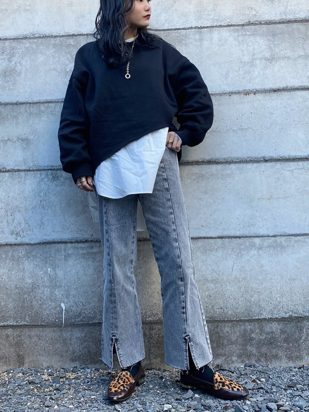 . . ▸︎▹︎パンツスタイル スリット入りデニムパンツ、すごくシルエットが綺麗でお気に入り!!! あんまりデニム履かなかったけど、このデニムは2色買いしましたぁ!! スウェットはGUのスウェットを アシメカットした✂︎✂︎✂︎