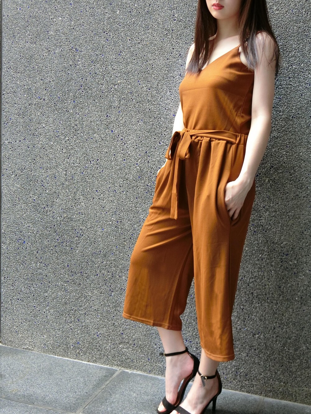 細肩背心搭配寬褲黑色高根鞋,成套也很好看
